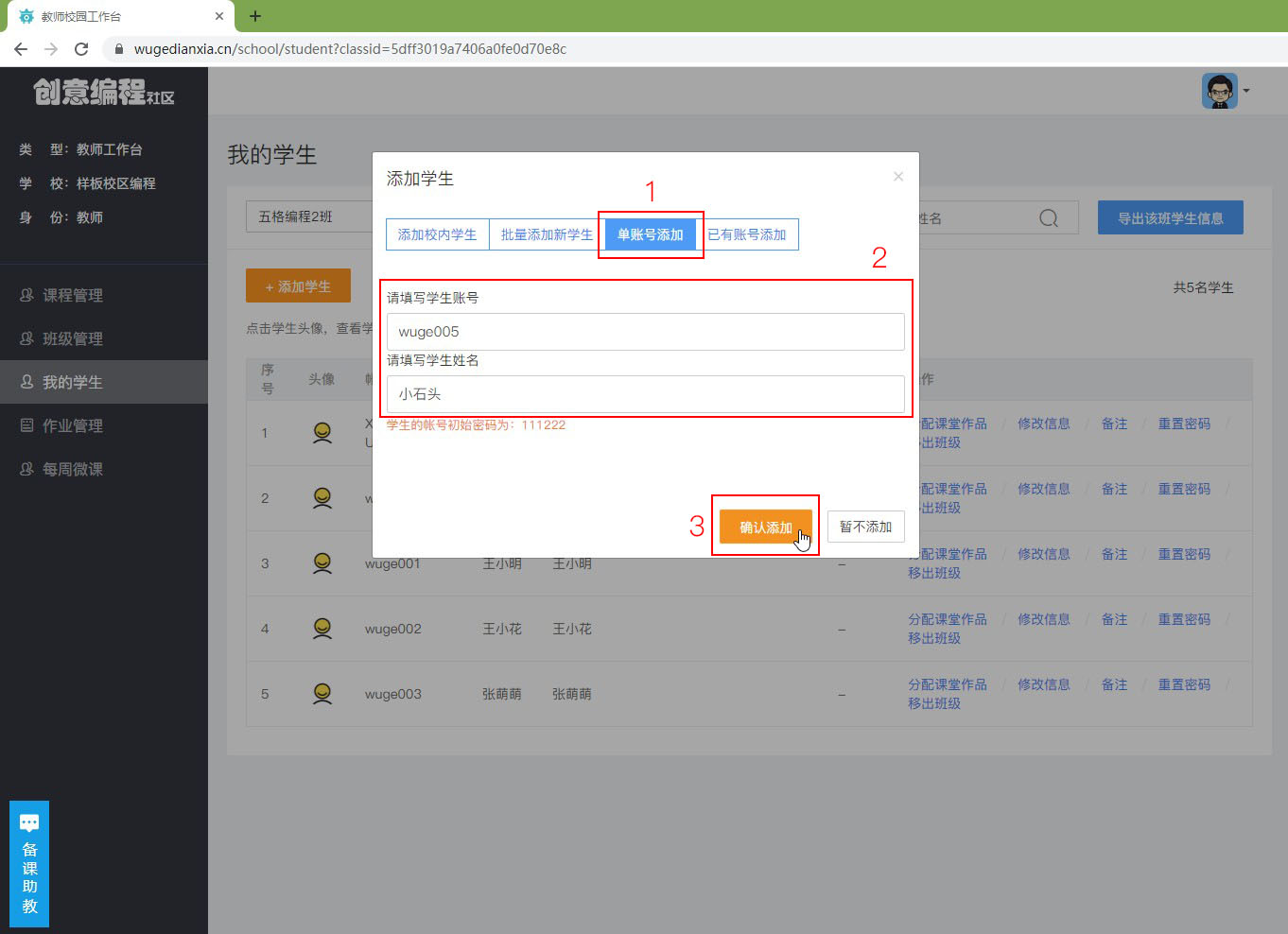 * ## 选择**单账号添加**,输入学生账号和学生姓名,然后点击**确认添加**按钮