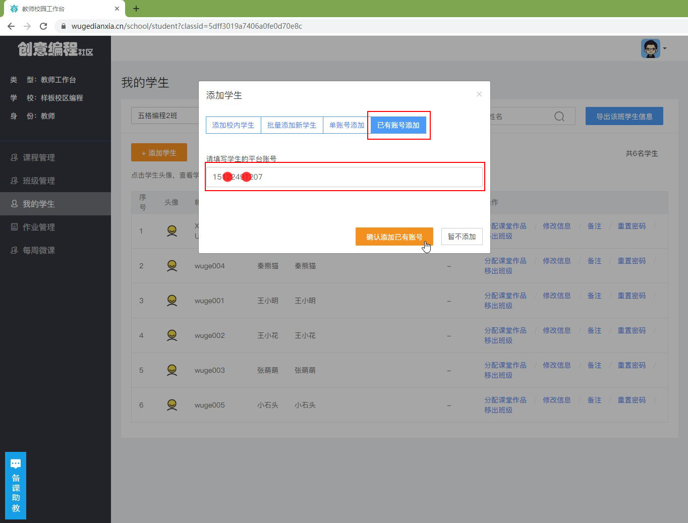* ## 选择**已有账号添加**,输入学生账号,然后点击**确认添加已有账号**按钮