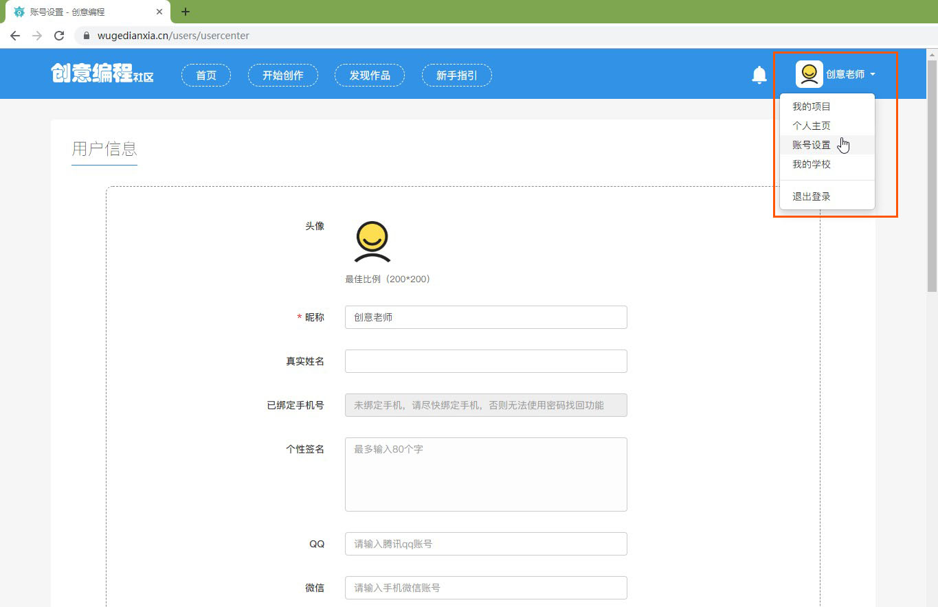 ## 点击右上角创意教师,点击 【 账号设置 】 选项