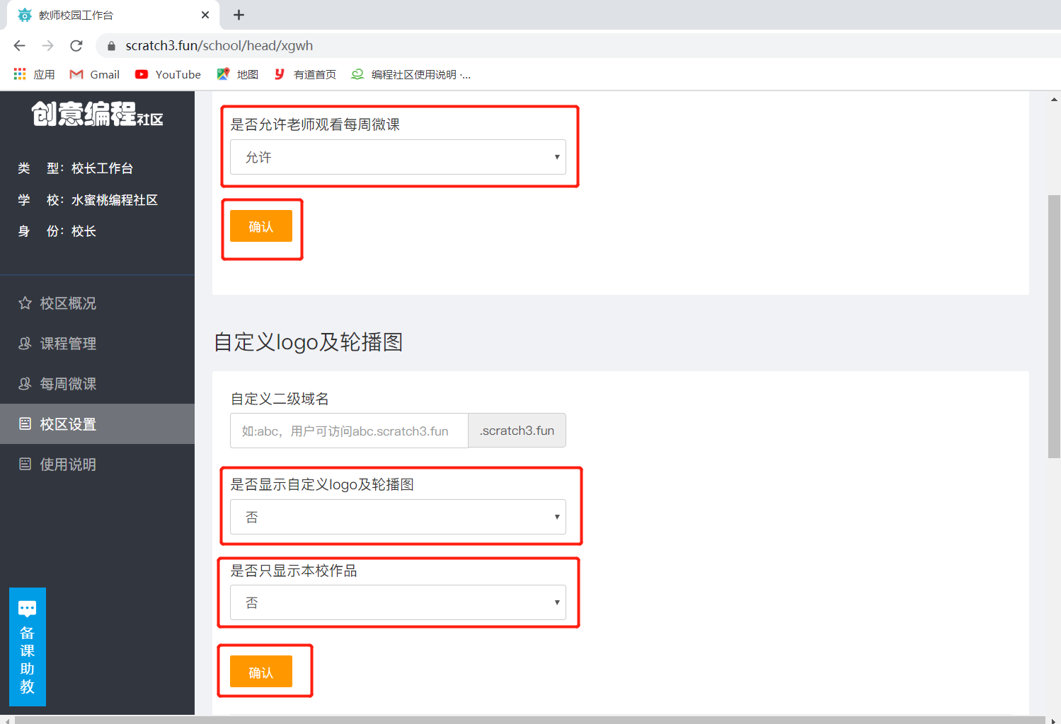 * ## 点击 【 校区设置 】 在这里可以设置**是否允许老师观看每周微课**、**是否显示自定义logo及轮播图**、**是否只显示本校作品**,设置完成后点击【 确认 】按钮
