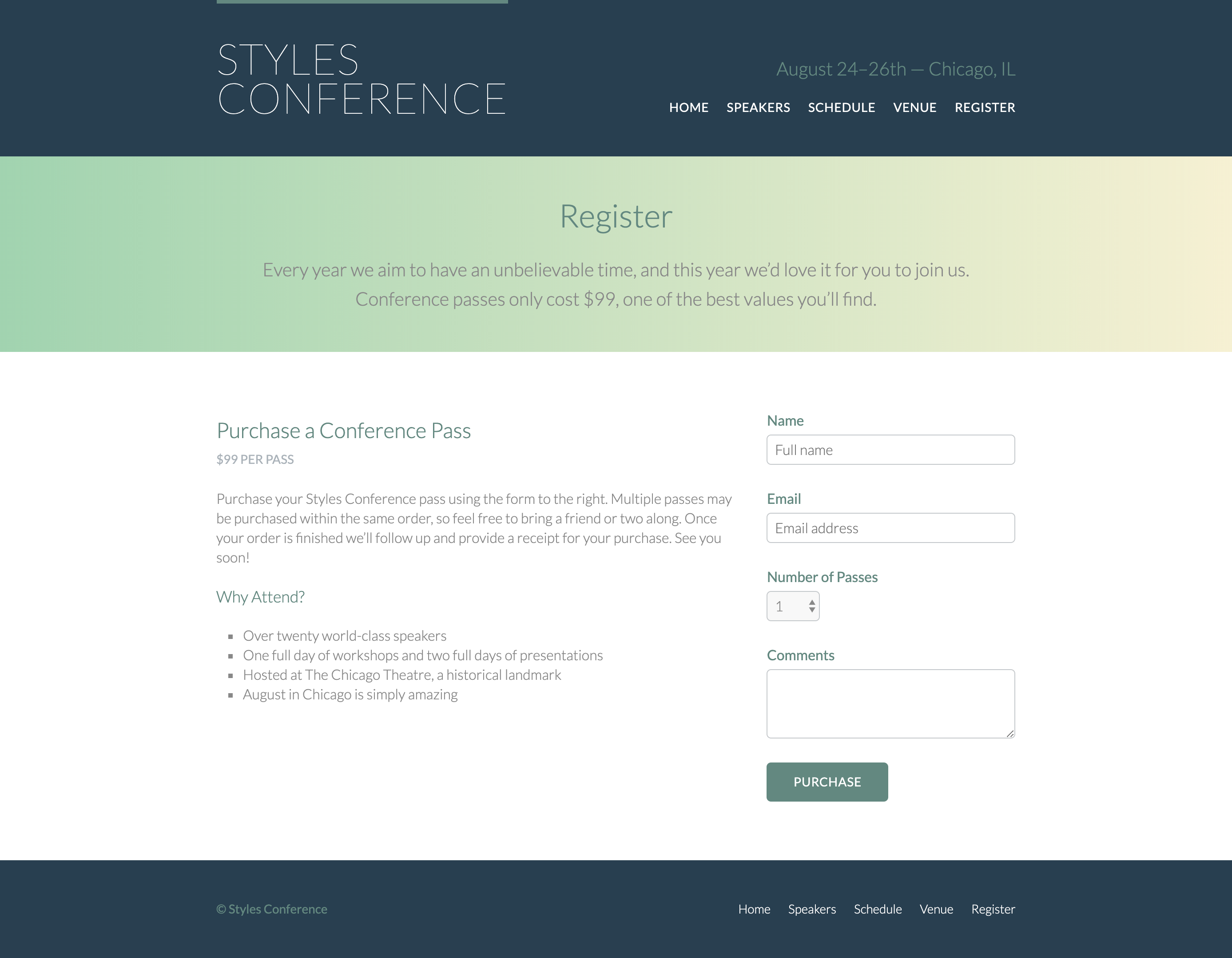 <p>Purchase your Styles Conference pass using the form to the right. Multiple passes may be purchased within the same order, so feel free to bring a friend or two along. Once your order is finished we’ll follow up and provide a receipt for your purchase. See you soon!</p>