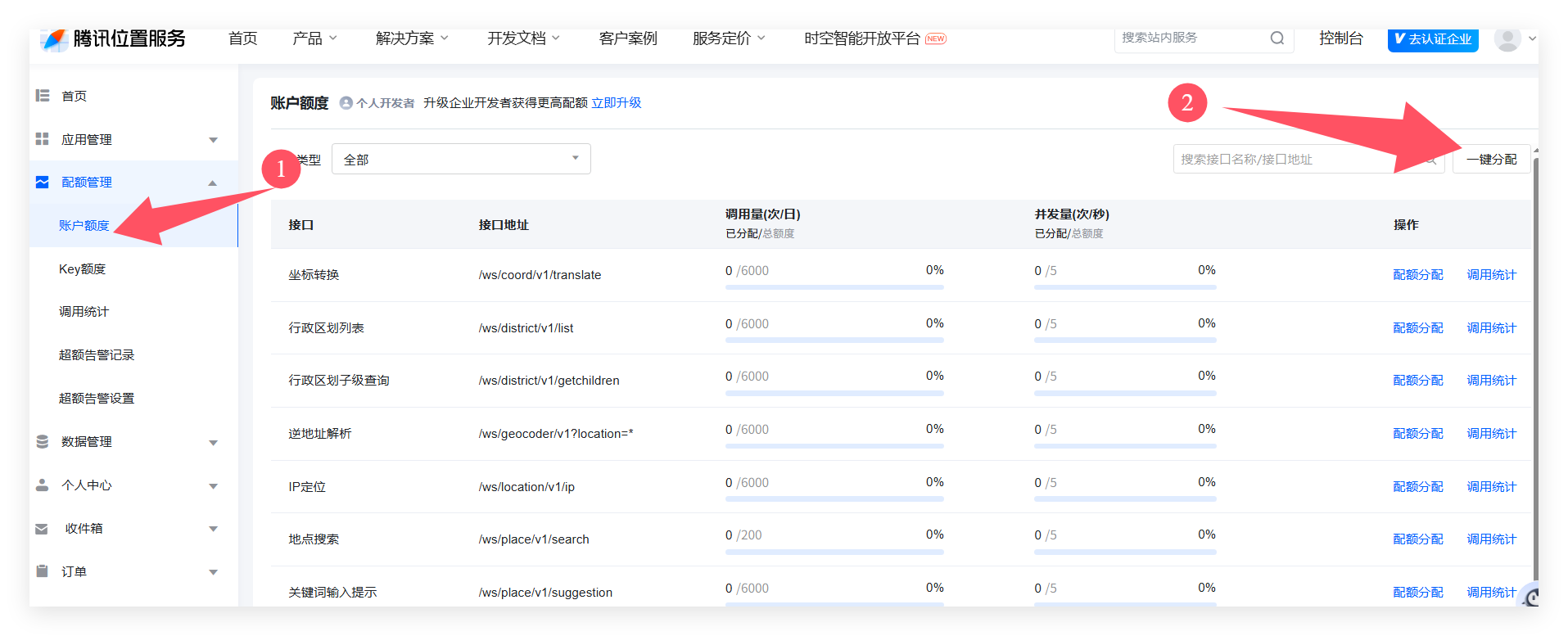 * **注意了,到这并不能表示这个key可用了,腾讯地图跟其他地图有个不同点就是需要自己分配额度,否则这个key没有额度使用,功能一样不等你实现**