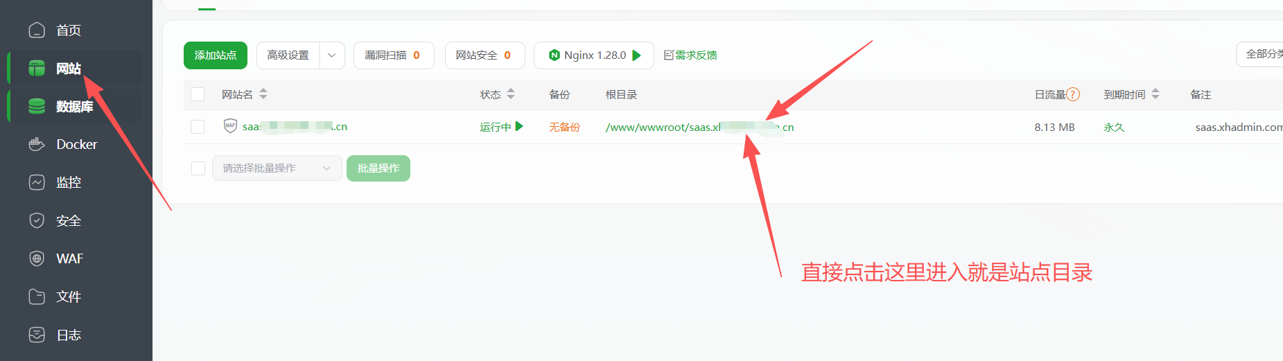 4. 打开宝塔,找点站点,点击进入站点目录,上传文件到这个目录(非public!也就是和public同级的目录)。