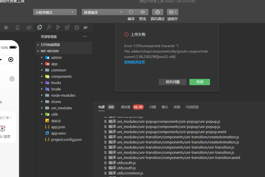 如果小程序上传失败提示以下错误,需要取消上传代码时自动压缩wxml文件,重新上传即可;