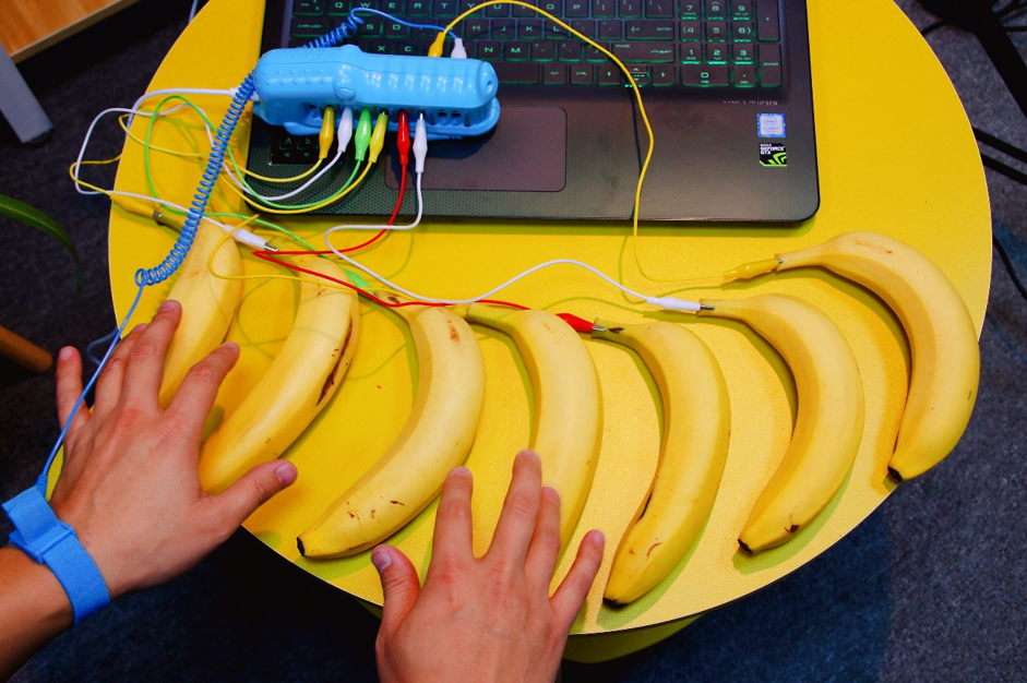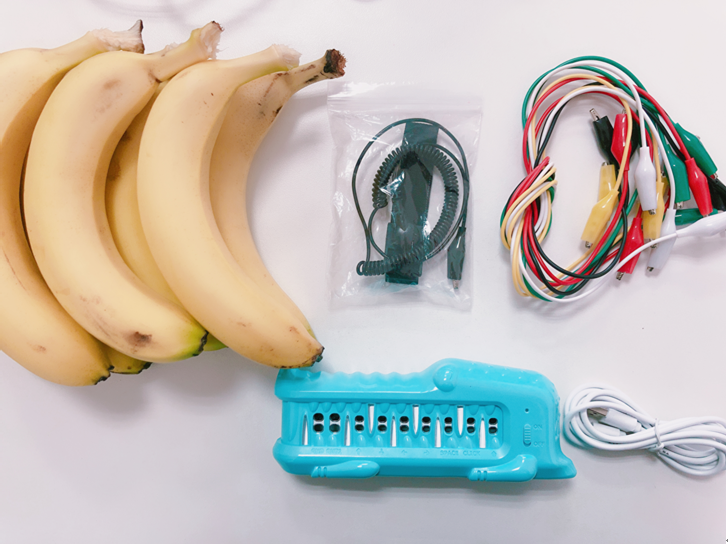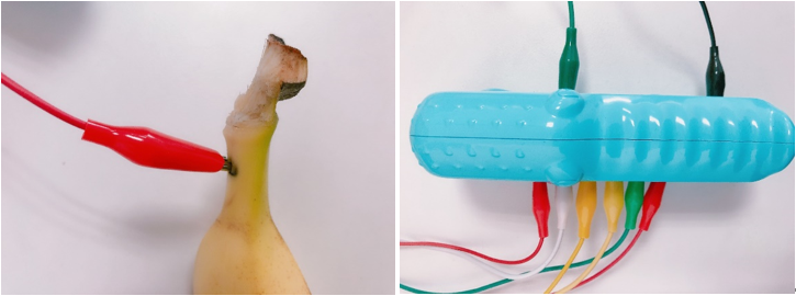 * ### 左手戴上接地手环,右手拍击水果来弹奏一首美妙的歌曲,尝试一下《两只老虎》或者《小星星》吧