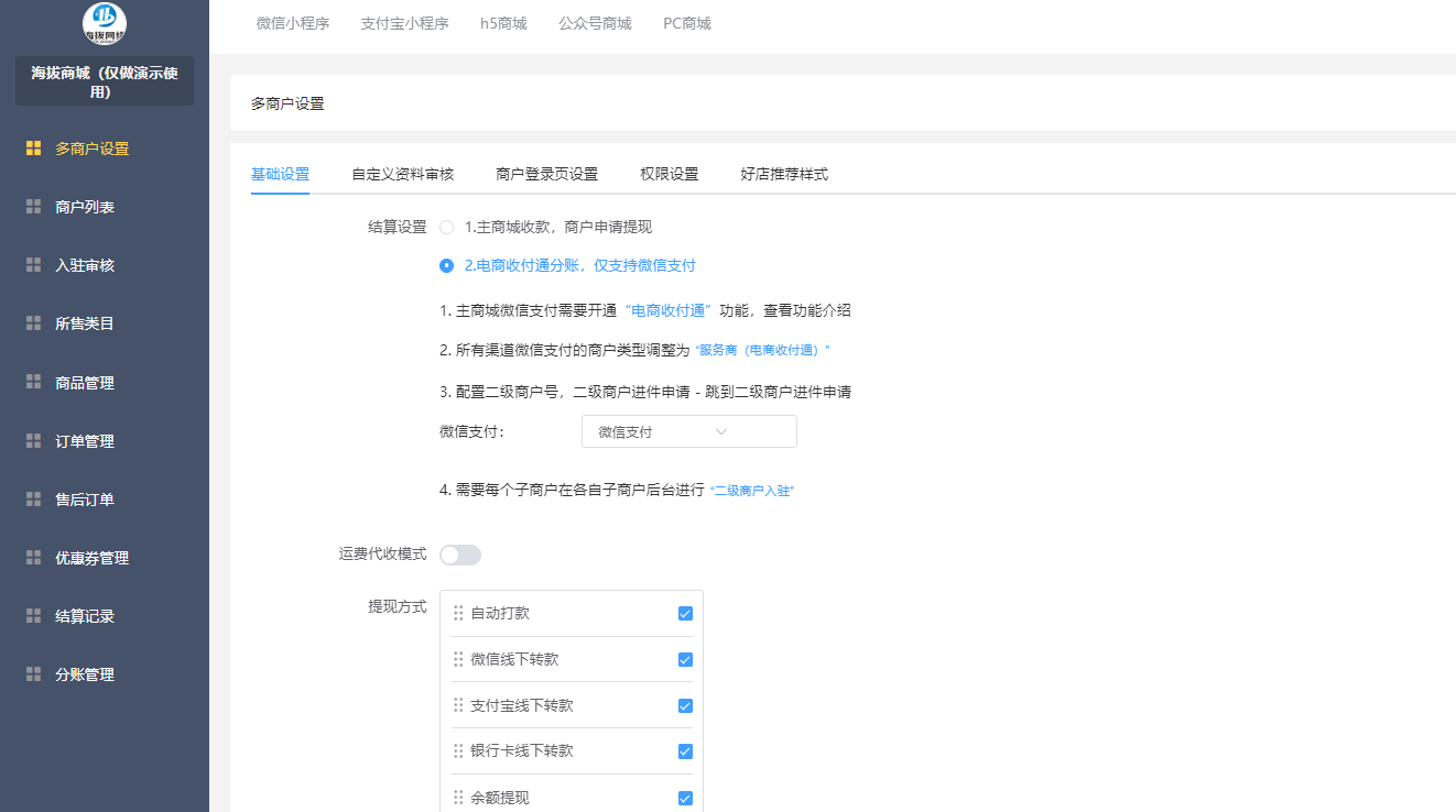 * 支持选择提现方式,多商户的用户在申请提现时使用