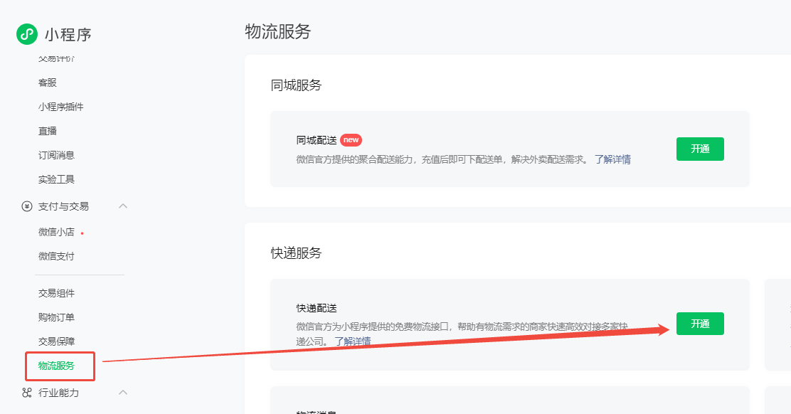 一、登录微信小程序公众平台,点击【物流服务】页面快递配送【开通】按钮(需要小程序管理员扫码)