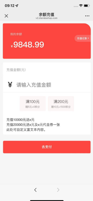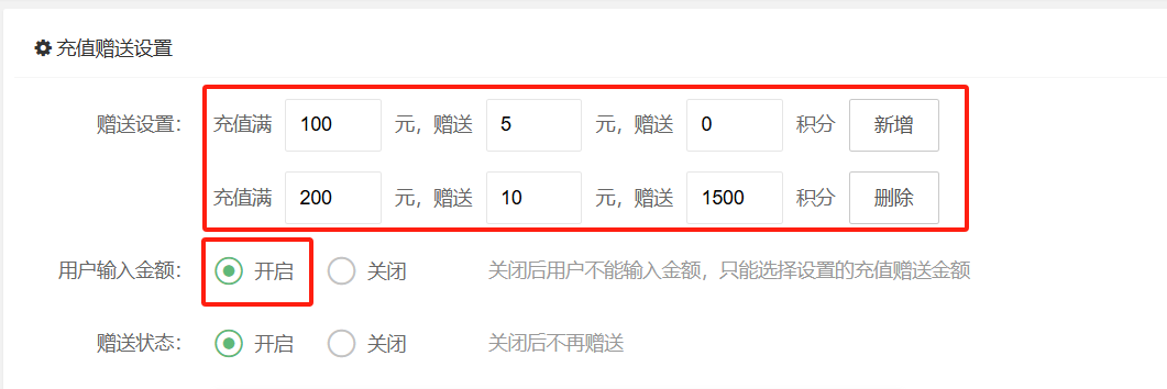 用于设置充值赠送活动,设置后用户即可在前端选择充值金额,达到设置的充值金额即赠送 。