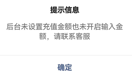 前端弹窗提示:后台未设置充值金额也未开启输入金额,请联系客服。