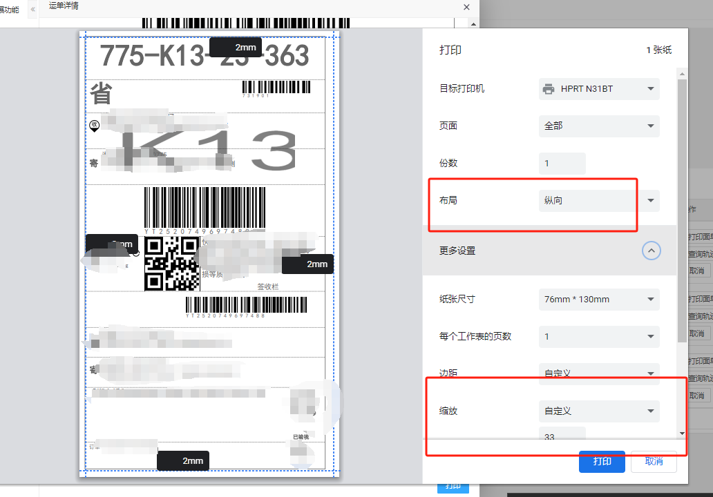 点击打印面单 -打印,设置打印的排版样式,进行打印快递面单。