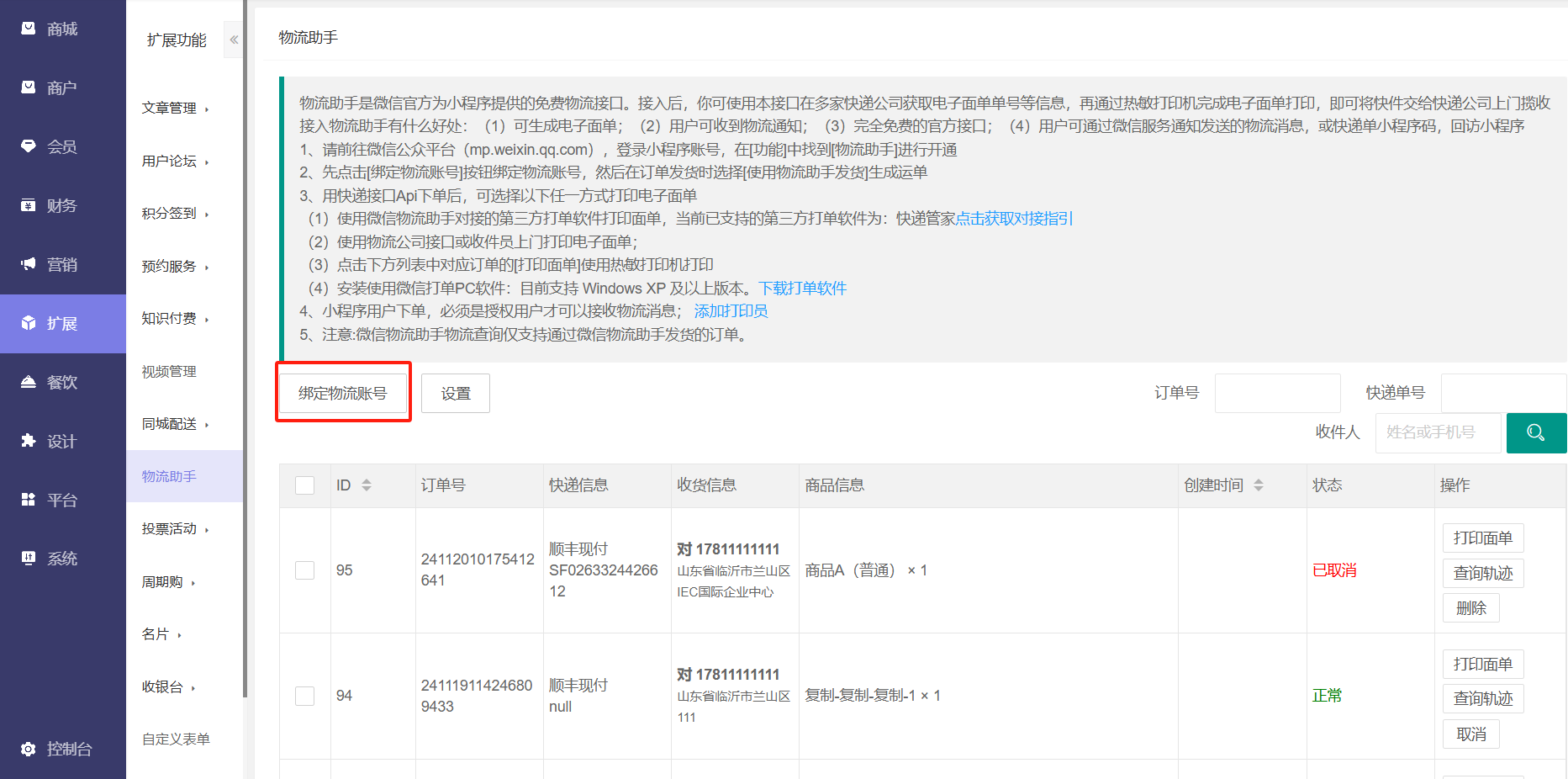 2、先点击\[绑定物流账号\]按钮绑定物流账号,然后在订单发货时选择\[使用物流助手发货\]生成运单