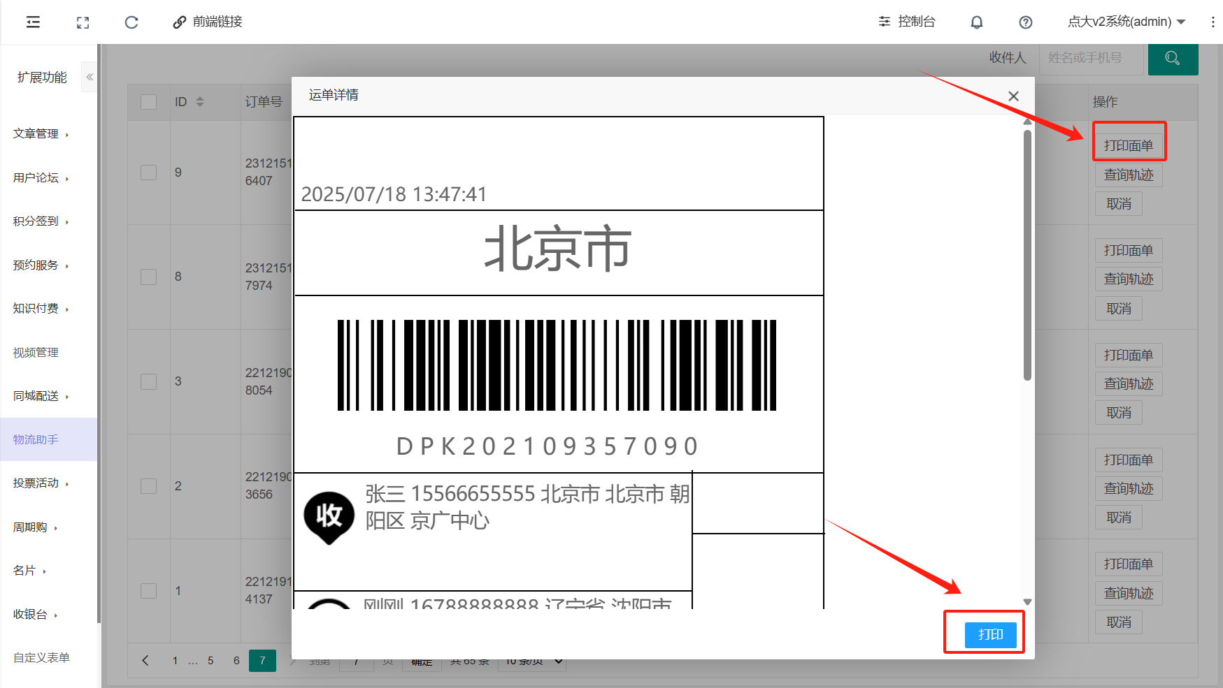 (3)点击下方列表中对应订单的\[打印面单\]使用热敏打印机打印