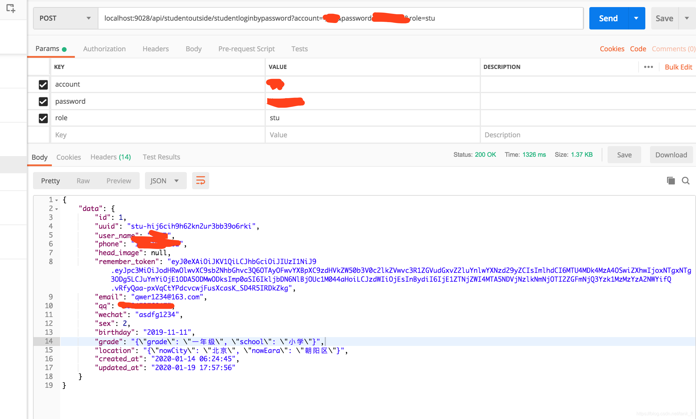 在登录成功后,返回用户信息和JWT token。用户信息用于前端展示,token将由前端存在本地,在后面需要身份验证的接口中带过来。