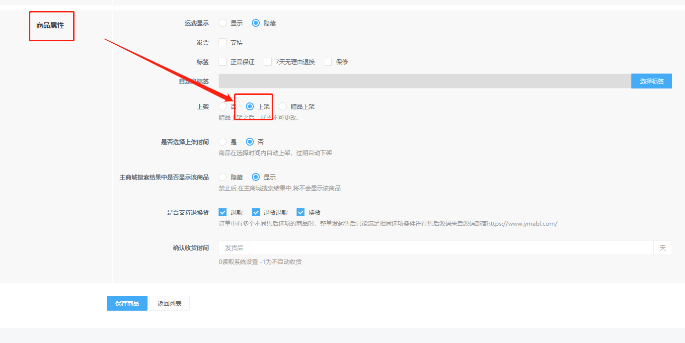 **第三步:**在【商品属性】里面选择状态为【上架】