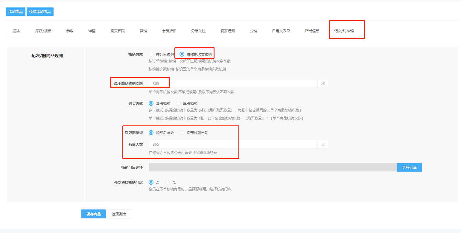 2.设置单个商品的核销次数(单个商品支持核销的次数)