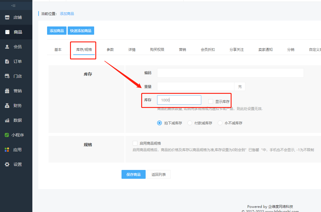 **第四步:**点击上方菜单栏的【库存/规格】并在新页面填写商品库存