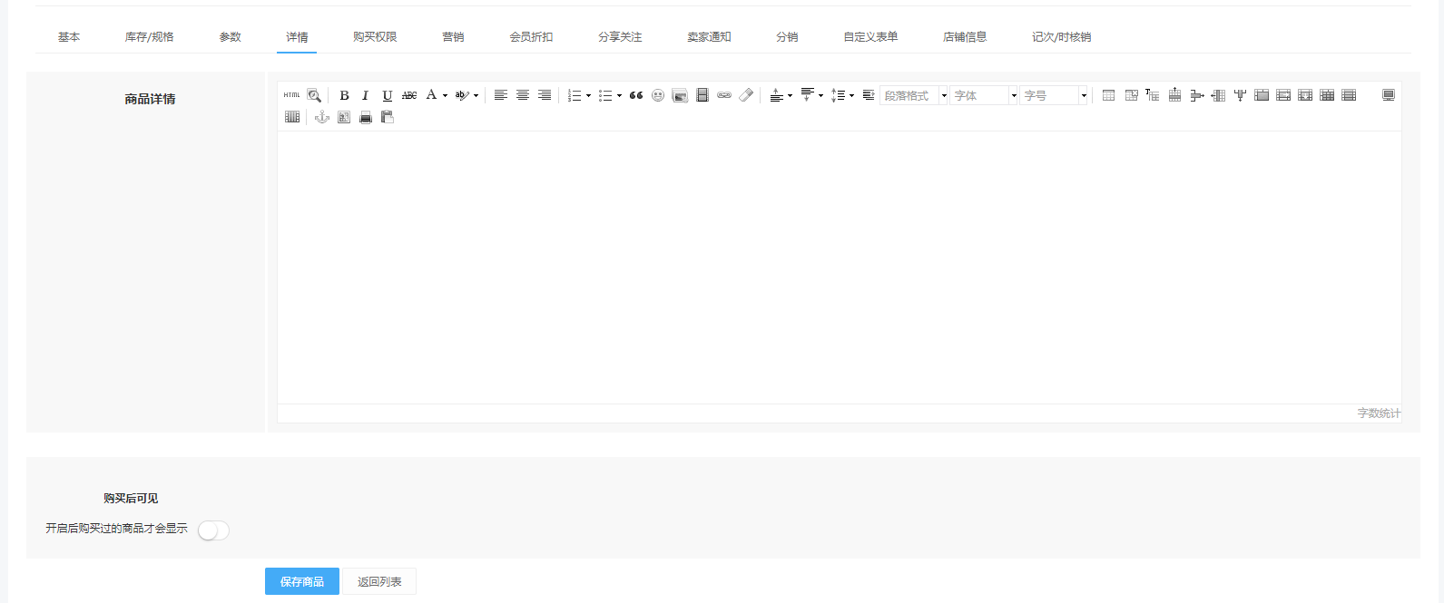 **第五步:**点击上方菜单栏【详情】,并在新页面添加商品详情页(可以不添加,不影响用户正常下单购买)
