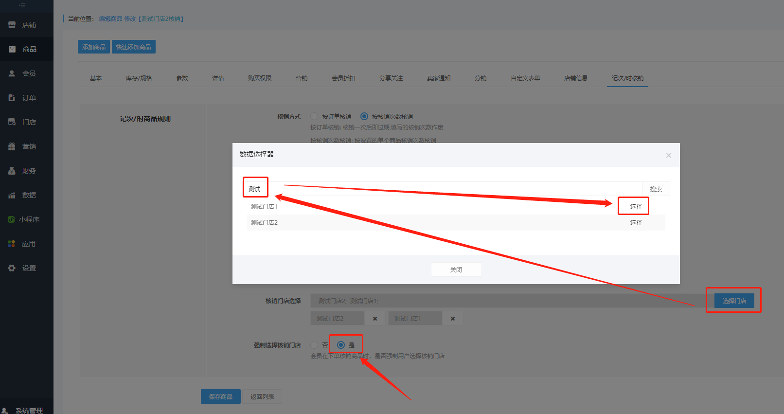 4.设置该商品/卡券允许核销的门店,如果是单门店,下方【强制选择核销门店】,一定要勾选【是】,然后保存即可。