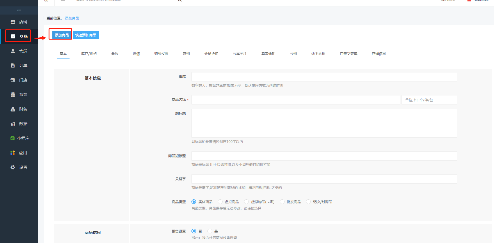 **第一步:**选择【商品】-【添加商品】,在新页面中完善商品信息