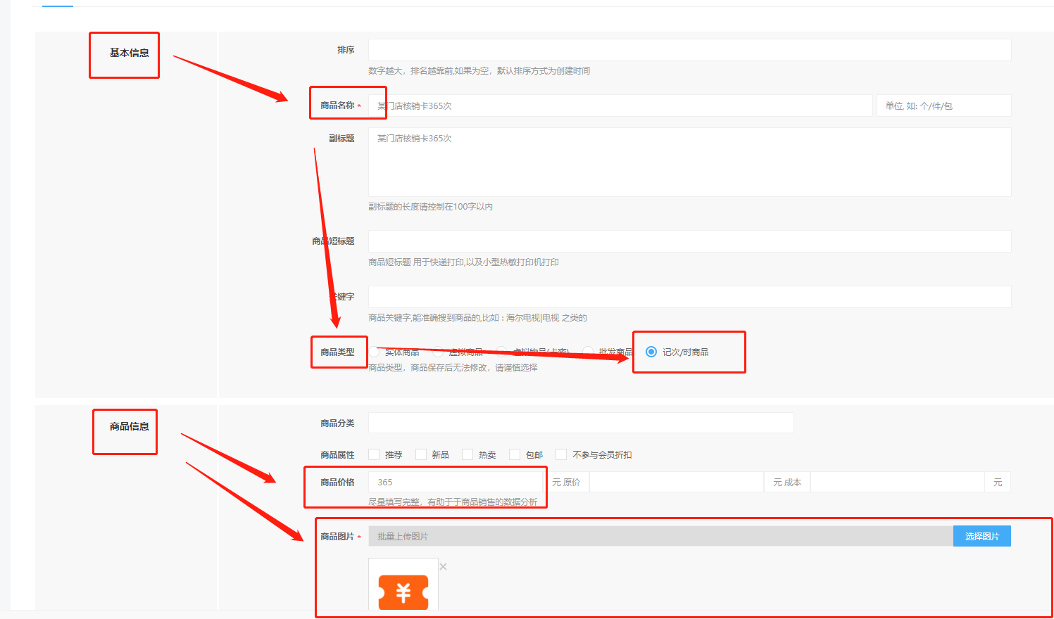 **第二步:**在商品编辑的【基本信息】里面填写商品名称和选择商品类型,商品类型需要选择【**记次/时商品**】