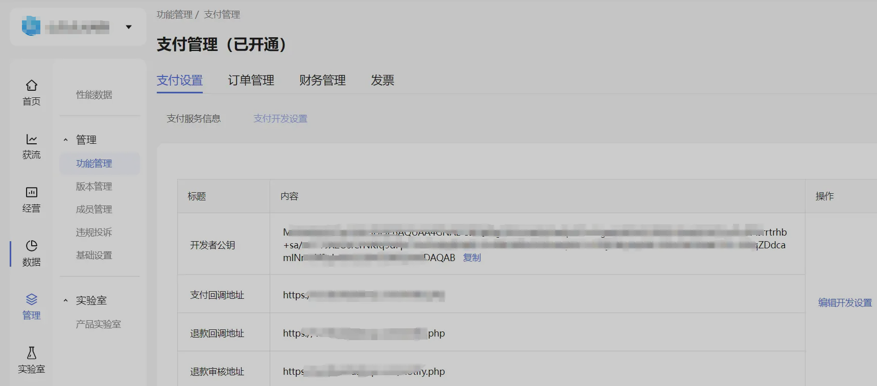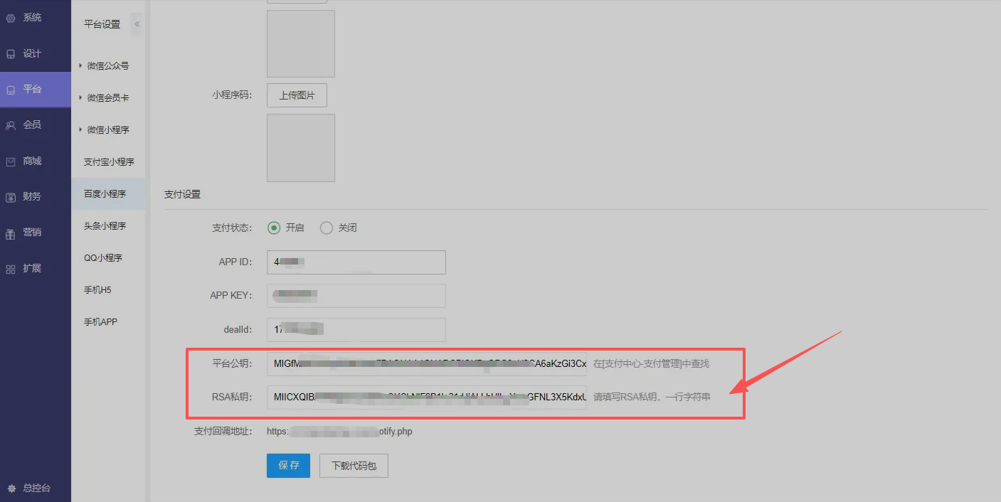将生成的开发者公钥及支付回调地址填写到支付设置---支付开发设置中