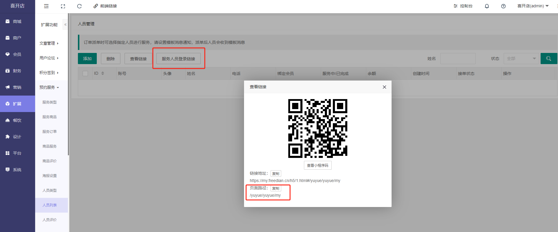第三步:后台人员管理列表上放,点击扫码查看服务人员手机端,会出现登录二维码