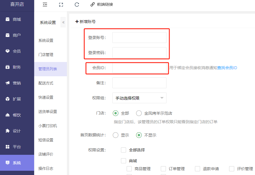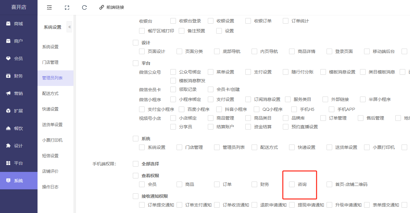 第一步:系统—管理员列表里添加管理员,给管理员添加手机端权限