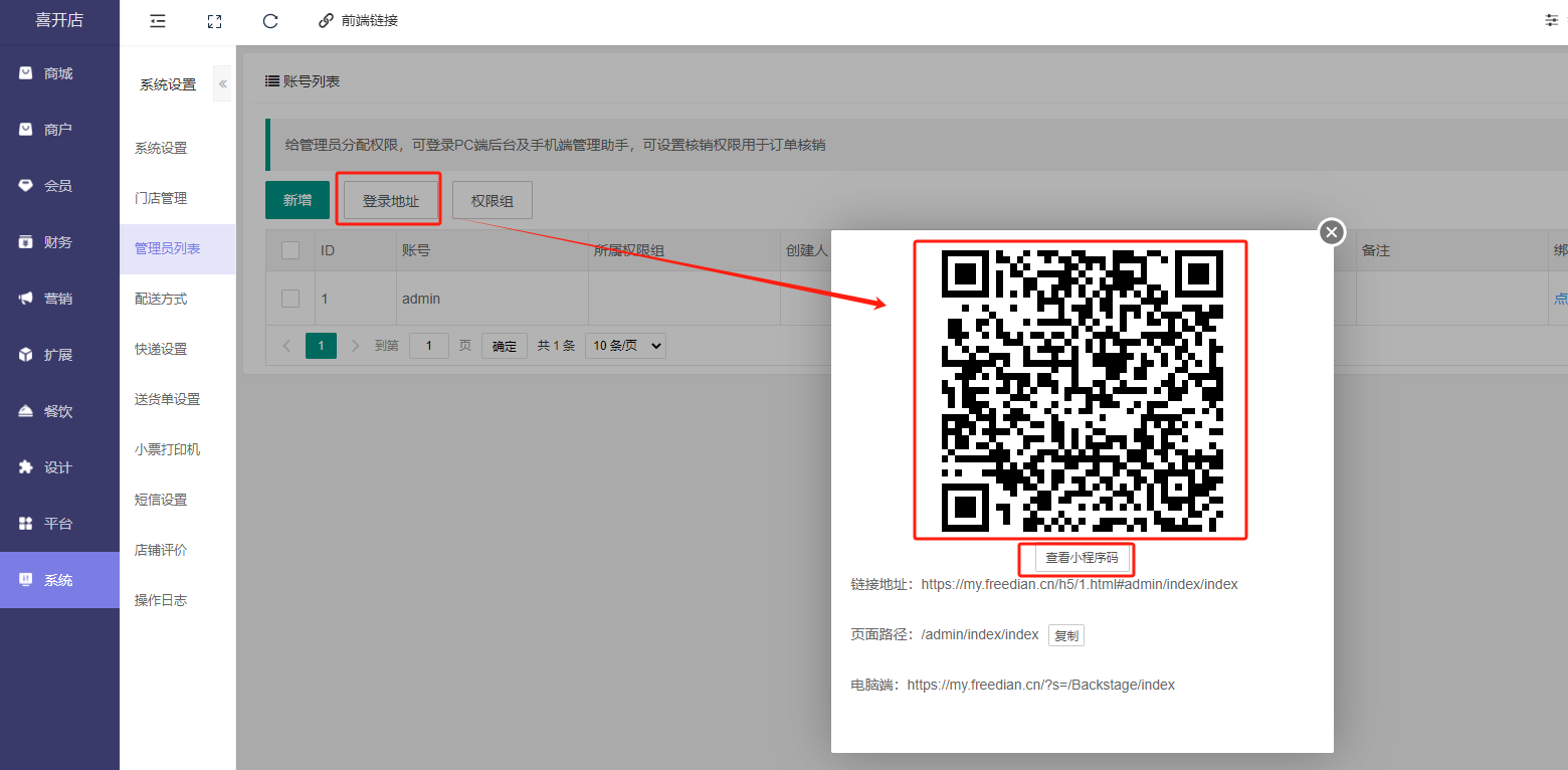 第二步:商城后台——系统——新增管理员列表——登录账号,密码,ID,选择权限组——提交