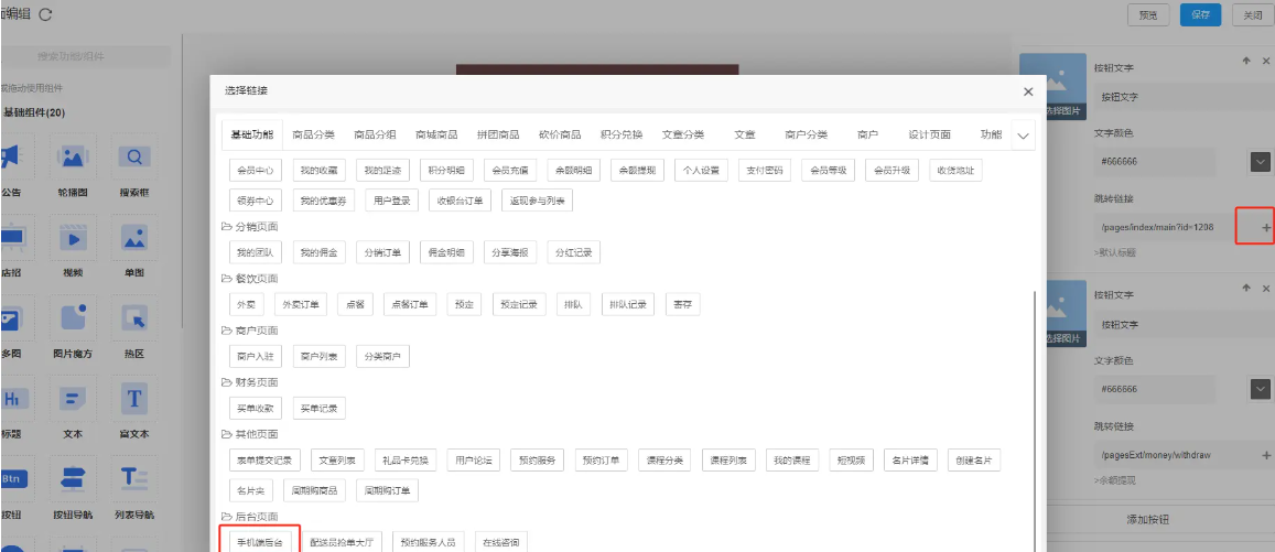 3、后台---设计---页面设计---添加组件---选择链接----选择“手机端后台”---有核销功能的管理员在前端通过这个组件登录手机端后台---点击右上角的扫一扫
