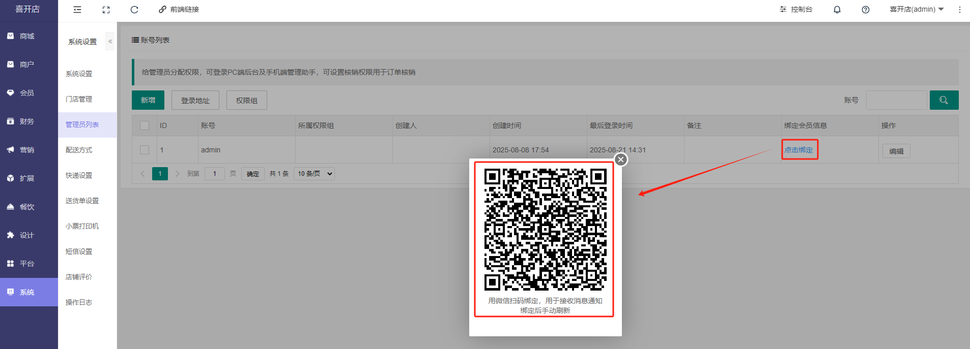 1、商城后台---系统---管理员列表---登录地址---微信扫公众号码或小程序码,登录会员账号后输入管理员账号密码登录管理员账号进行绑定---管理员账号里点击右上角的扫码图标去核销