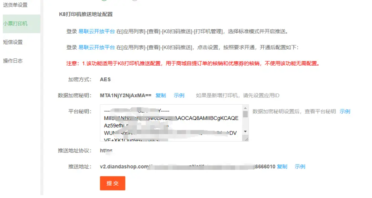 >注意:1.该功能适用于K8打印机推送配置,用于商城自提订单的核销和优惠券的核销,不使用该功能无需配置。