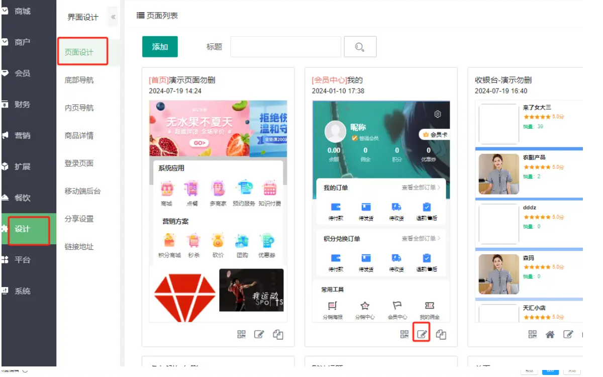 第二步:后台---设计---设计页面---编辑设计页面---放组件(此处我们放的“按钮”组件,可自定义组件)----选择跳转链接“手机端后台”