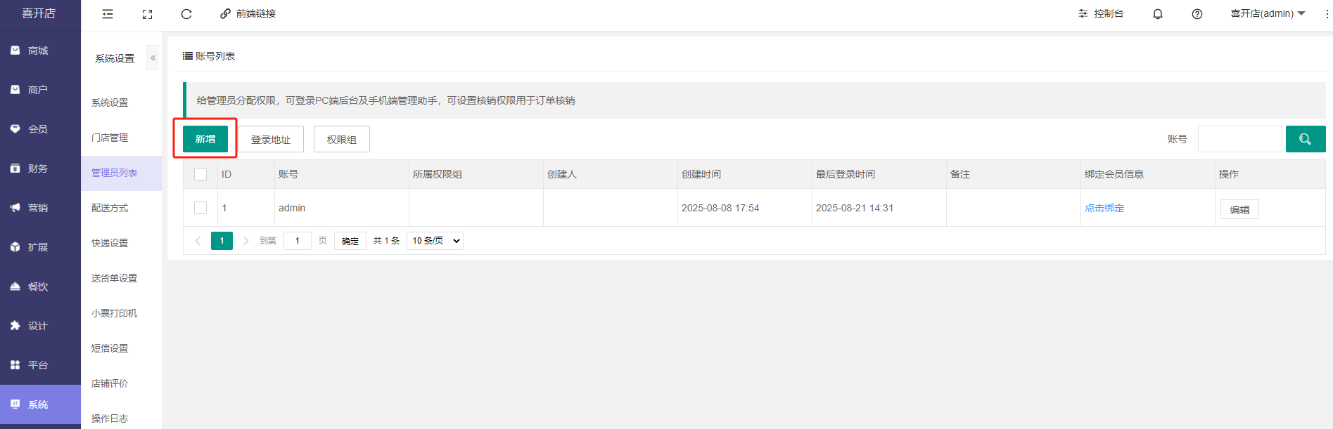 第一步:后台---系统---管理员列表---新增---填写管理员信息,登录账号、密码,**会员id**,选择权限