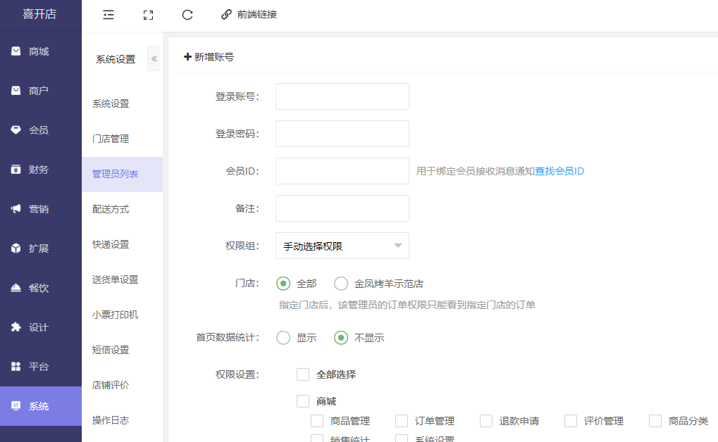 第一步:多商户后台---系统---管理员列表---新增---填写管理员信息,登录账号、密码,选择权限