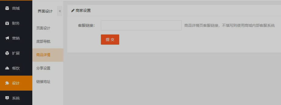 注:商品详情页客服链接,不填写则使用商城内部客服系统