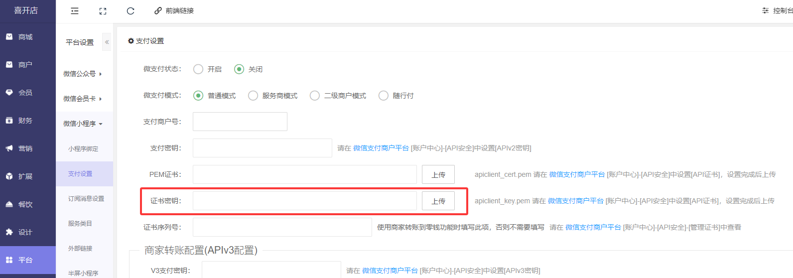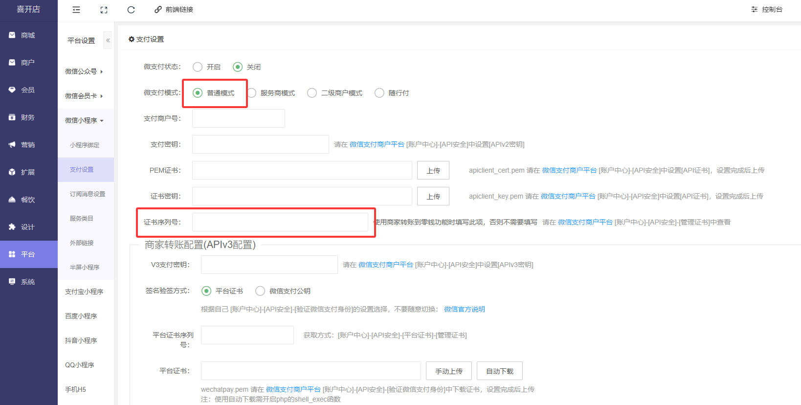 后台---平台---微信公众号/微信小程序---支付设置里设置“**证书序列号**”和“**商家转账配置(APIv3配置)**”