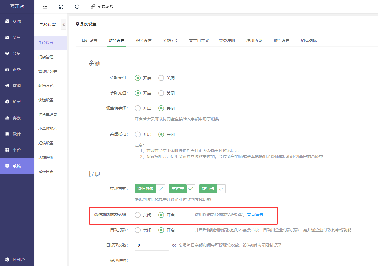 后台---系统--系统设置---财务设置---提现:开启“微信新版商家转账”