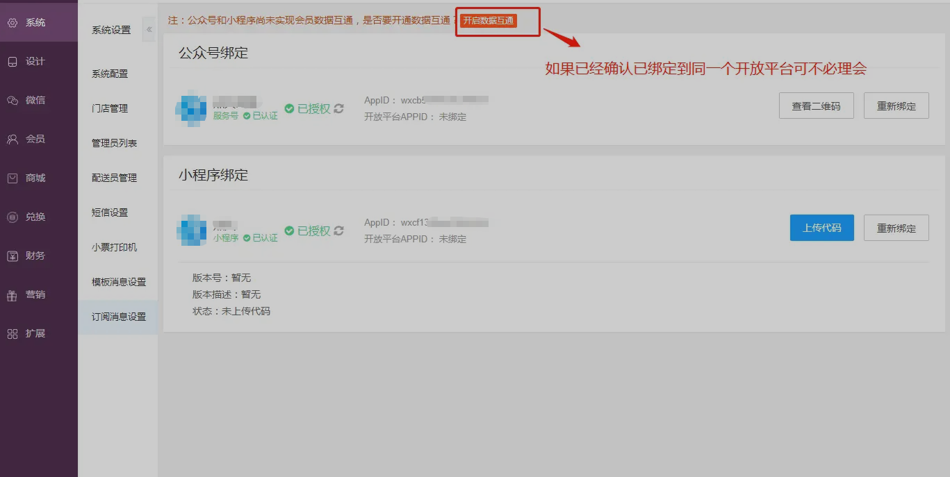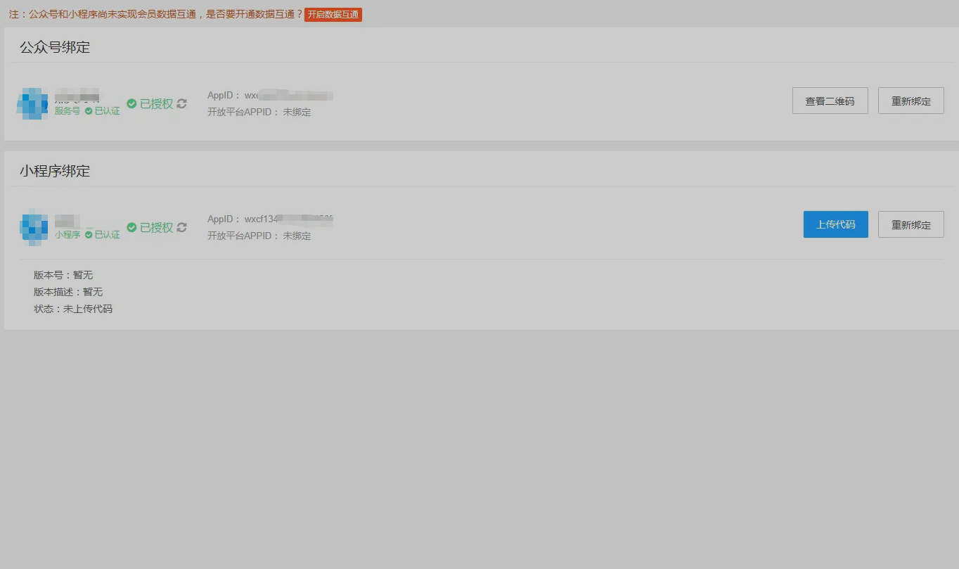 如果微信公众号及微信小程序均用授权绑定,则在绑定页面上方会提示是否开启数据互通